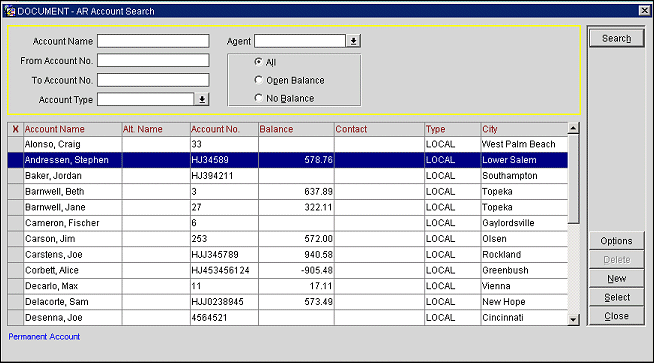 Starting from the AR Account Search screen, you can either create a new AR account, or edit an existing AR account.