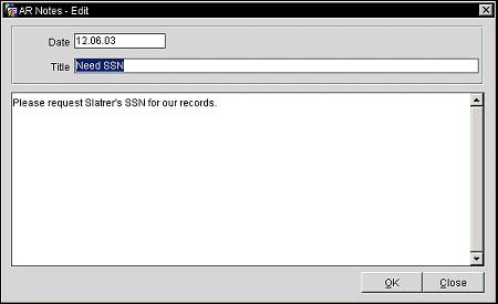 When creating a new note, the date has already been populated with the system date (current date). The Title field is a free typing field and is used to allow the user to make this note more specific. The text section is a free typing area where you can note all the information required. Alpha-numerics are accepted. Select OK to save these changes, or Close if you don't want to save these changes.