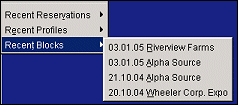 Note: The Recently Used feature (available when the General > Recent Used Records Menu is set to Y) allows you to quickly access up to 10 of the last-used (created, opened, or changed) profiles, reservations, and business blocks from the main OPERA menu bar. (When the OPS/OPC<version number> Sales and Catering license is also active, up to 10 recently used contacts, events, and accounts are additionally available.)