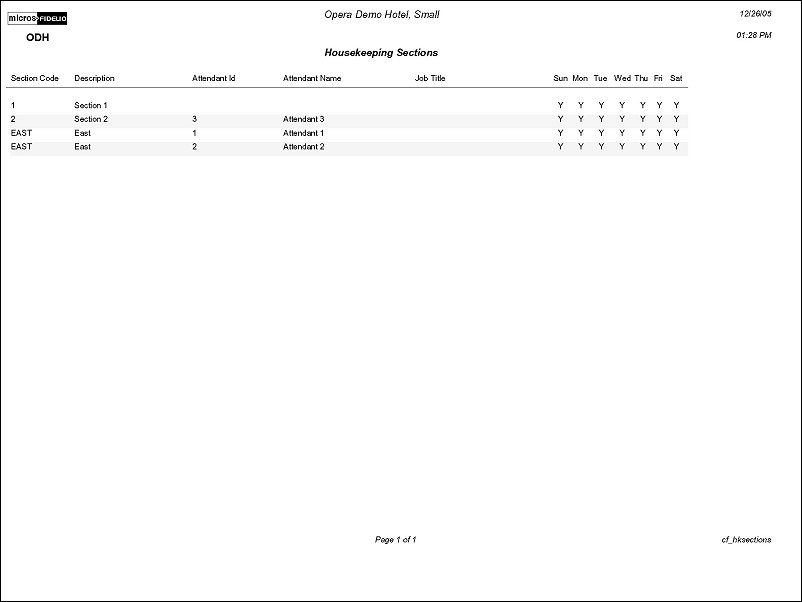The Configuration report for Housekeeping Sections will display all Housekeeping Sections and Days Of the Week that corresponds to the Attendants that have been defined for your property.