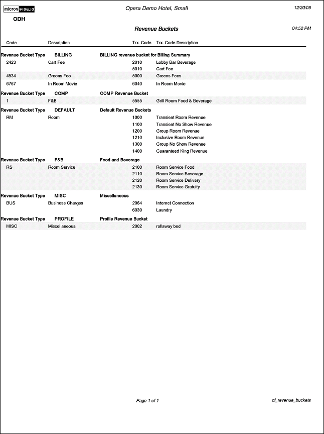 The Configuration report for Revenue Buckets will display the transaction codes associated with the various Revenue Buckets. When the Profiles>Profile Revenue Buckets application function is active, the user can configure and see the generated Reservation History revenues by configured buckets. This is accessed in Profile>Options>History>Revenue.