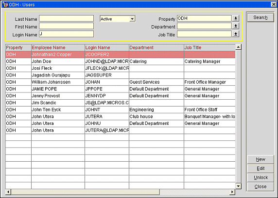 Note: For users who access OPERA via LDAP integration, the Job Title and Department fields will be automatically filled in provided a Title and Department are provided for the user in the LDAP directory, and matching Job Title descriptions and Department descriptions have been configured in OPERA. OPERA Job Title and Department descriptions, along with their corresponding codes, must be identical (including case sensitive) for all properties. For information on setup for LDAP, see LDAP Integration.