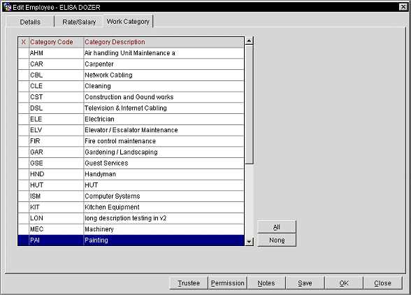 The Work Category tab only appears if the OPP_QMGS Quality Management System add on license is active. This is used to assign specific work categories to a user, so that when a task is created, it can automatically be assigned to a particular work category and then to a particular user within that category, if it has been configured for the user.