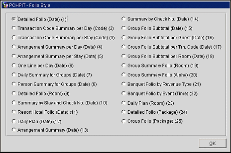 Note: The property default folio style for cashiering screens is set via the CASHIERING > FOLIO STYLE application setting. For AR folios, the property default is set via AR > AR Folio Style. (The numbers associated with the folio styles described below correspond to the folio style numbers available for selection when you set this parameter.)