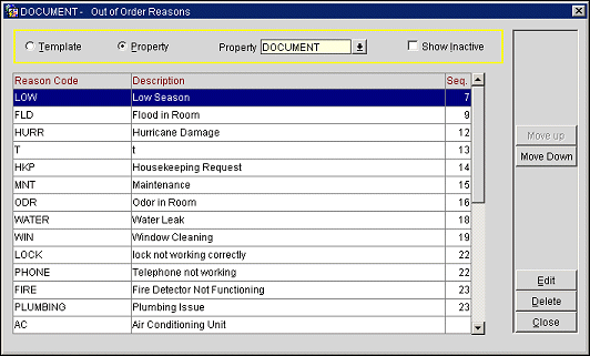 Use the Property screen to change or remove codes, reasons, or locators for a particular property. Click the Property option button to select a particular property from the property list. The property screen displays a list of codes that are used specifically at this property. The grid titles are displayed in red. Click the column heading you want to sort by and the column heading turns green. To display records from another property click the Property drop down arrow to select a different property from the list.
