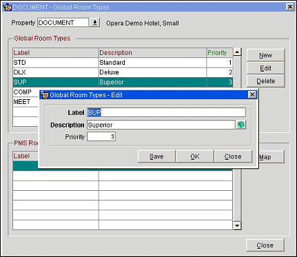 The upper grid (Global Room Types) shows the global room types that have been set up for the property. When a global room type is highlighted, the lower grid (PMS Room Types) shows the regular PMS room types that are included by the highlighted global room type.