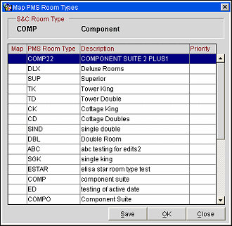 To map a global room type to PMS room types, highlight the global room type in the upper grid and select the Map button. The Map PMS Room Types screen appears.