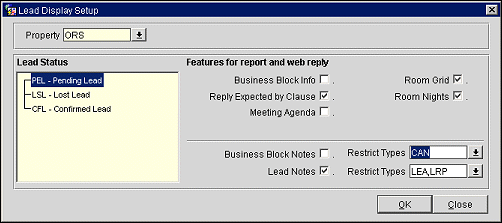 The SFA Leads configuration options are used to set up sales lead handling for SFA. (SFA features are available when the OPF<version number> OPERA SFA license is active.) The Lead Display Setup screen can be used to control what information is displayed on the Lead Reply form, depending on the lead status. The Lead Reply form is typically e-mailed or faxed to the lead contacts using the Leads screen. See Adding, Sending, and Resending Leads for details.