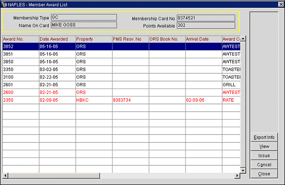View. To view the award history details, highlight the award and select the View button. The Member Award screen appears. This information is read-only and is used to review the guest's issued or canceled award details.