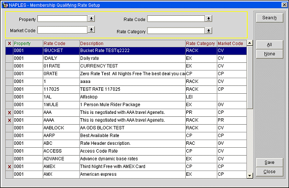 The Qualifying Rates form allows you to select or clear the membership check box for multiple rate codes.  This screen is useful because several rate codes can be changed in this one screen.  If you don't use this screen, the Membership check box must be selected or cleared manually in the Rate Setup window for each rate code.