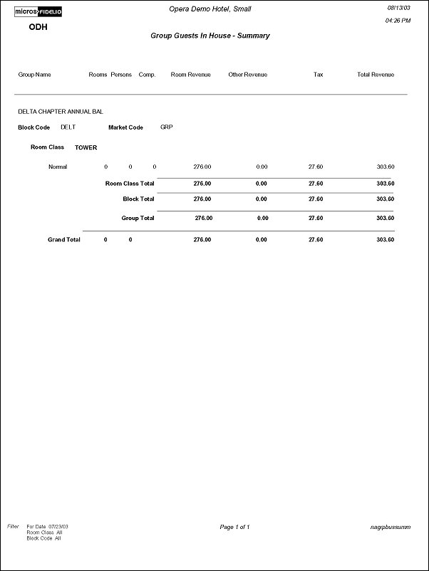 The Groups In House Summary Report lists each Block names currently in-house, number of rooms, persons, and revenue associated with these rooms. Print this summary report to determine the actual number of rooms that have materialized.