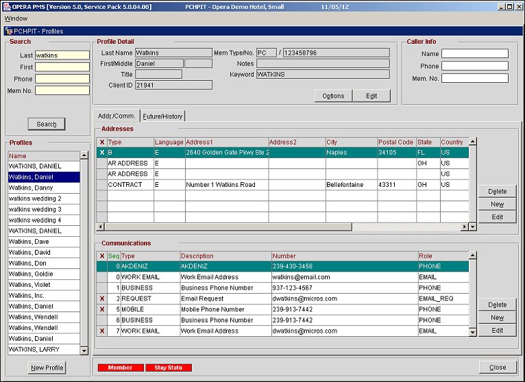 Displays all of the profiles that match the search criteria that was entered when the Profile Search was completed in the Search section. Based on the profile that is selected in this section, details attached to the profile will be populated in the Profile Details, Address/Communication Tab, and Reservation Future/History Tab. If the desired profile is not found, a new profile can be selected by selecting the New Profile button.