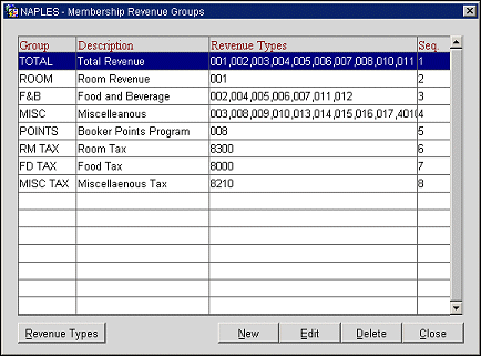 In ORS and in OPERA PMS, go to Setup > System Configuration > Setup > Profiles > Memberships > Revenue Groups > Membership Revenue Groups screen opens > select Revenue Types button. Membership Revenue Groups are not created until the Revenue Types are created. Membership Revenue Types have to be the same Revenue type Code as previously configured in the Cashiering application (see the Revenue Setup just above).