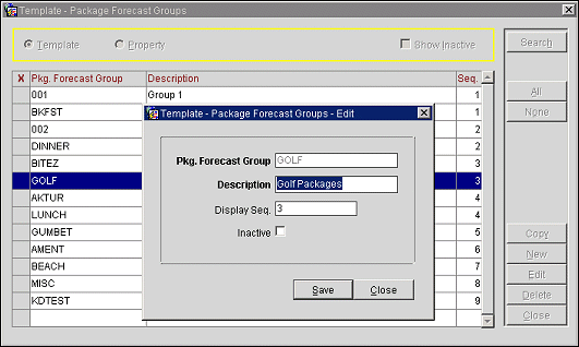 This screen defaults to the Template list of package forecast groups to assist you in copying them to other properties. Select the Property option button, and then a property from the property list to create, modify, or delete package forecast groups only at that property.