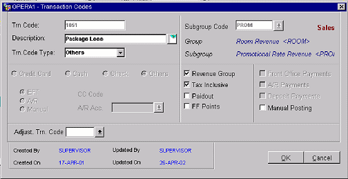 On the End of Day Sequence of February 27, the $200.00 room charge is applied to the guest and a next day credit for the item price of $25.00 is created internally by the system. The guest goes to the breakfast outlet on February 28 and a POS charge of $35.00 is debited against the guest account. OPERA will then apply this charge against the allowance that was generated during the End of Day Sequence. The resultant is that the item price was exceeded, but the allowance wasn't. The guest doesn't have to pay the extra $10.00 at the F&B outlet. Internally, the property accepts a package loss and accordingly we post to this transaction code configured for package loss. This is classified as a Package Loss. Usually in this case the property will pay the F&B outlet the difference.