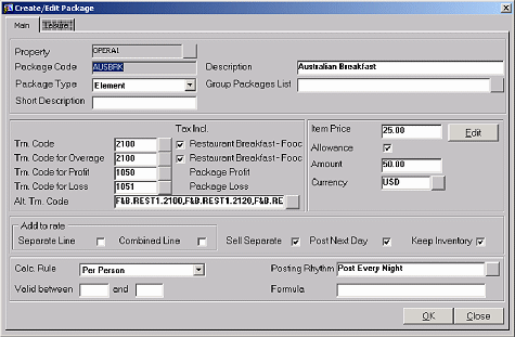 In this scenario the guest spent $24.00 for breakfast. The allowance was up to $50.00 but the item price was $25.00. OPERA posted a Package Profit of $1.00 in this case.