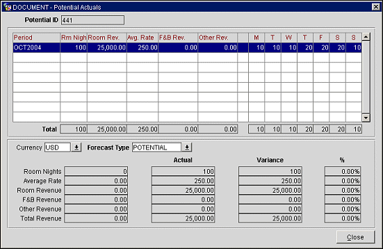 The Potential Actuals screen shows all actual figures that are linked to the Potential by configured period for the whole duration of the potential. The comparison details at the bottom of the screen show actual figures versus the selected forecast types for the period that is currently highlighted in the grid on the upper part of the screen. The actual figures show a summary of room-nights, room revenue, average rate, F&B revenue and other revenue per period, as well as a breakdown of the number of room-nights by day of the week.