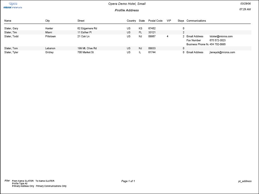 The Profile Address Report lists address information for the selected profile types.