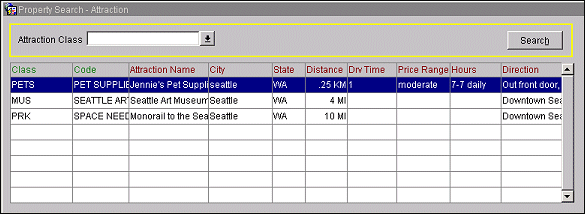 The Property Search - Attraction screen provides a list of the visitor attractions (sights, amusement parks, museums, etc.) in the area of the property that is currently highlighted on the Properties screen. Attractions are set up in System Configuration>Property>Attractions.