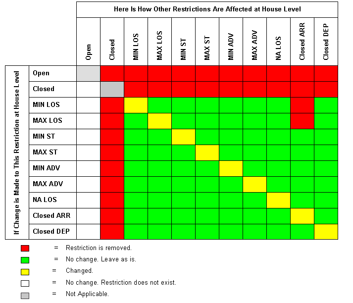 The following table provides a detailed look at how changes to a restriction for given dates at one level (in this example, at the House level) affect other restrictions at the same level.