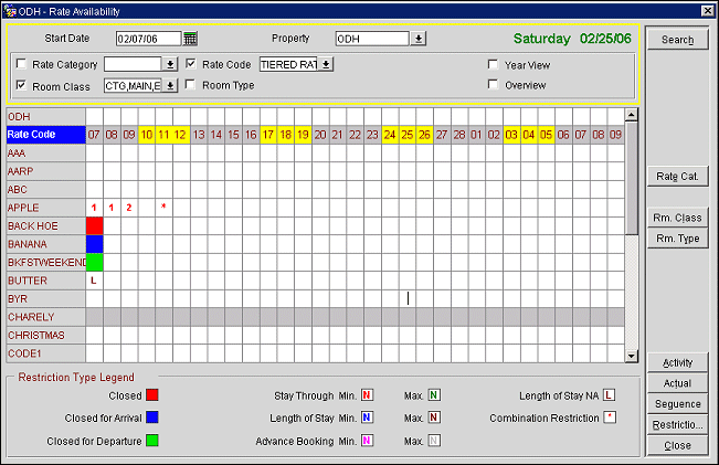 Rate Code. Display detailed restrictions by rate code for the selected date. This button is not available when the Rate Code check box is selected.