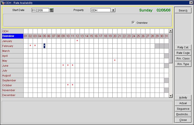 Overview. Select this check box to view rate availability by month and day for a 12-month period, starting with the month in the Start Date field. (You can scroll down beyond the current 12-month period to see availability for any month and date in the future.)  The Overview shows dates having any kind of restriction indicated by an asterisk. (When you select this option, the Rate Category/Rate Code, Room Class/Room Type, and Year View search criteria are unavailable.)