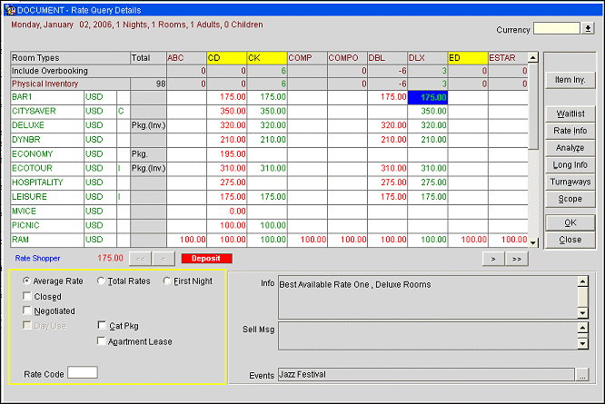 Info. For the highlighted rate, information about the rate code, followed by a description of the room type. This information is set up in rate code configuration and room type configuration, respectively.