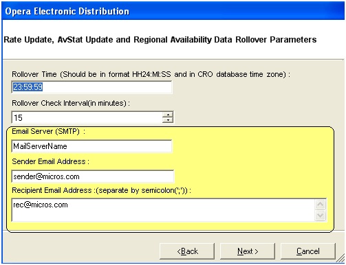 Enter the Recipient Email Address. Specify an email address to send email alert to users in case rate/restriction/price table rollover is not done on a regular basis automatically via the OAP utility. See Also: OAP Utility Service Parameters