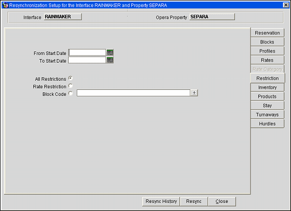To Resync from OPERA PMS go to OXI > Utilities > Resync > select tab Restrictions. At this time there is no resync of Block Restrictions available from ORS to OPERA PMS
