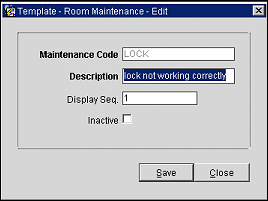 Inactive. Click this check box to mark the code as active or inactive. If it is inactive it is excluded from the display list from the Rooms Management>Maintenance screen.