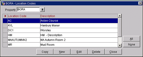 To copy location codes to other properties, select the location codes you want to copy by clicking in the X column to mark your choices (you may also use the All and None buttons). The select the Copy button. The Properties LOV appears. Choose the properties to copy locations to and select the OK button.