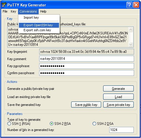 6. Use the menu option “Conversions > Export OpenSSH Key” (refer to screenshot below) to save the private key in the standard RSA format. Choose the same name for the private key as the one previously chosen for the public key, but a different file extension. Use a file extension that will help identify that this is a private key file that is in the standard RSA format. For example, "demo.pri" (Instead of using this menu option, if you use the “Save private key” button, the file will be saved in the putty format with an extension of ppk. This will not work in the OPERA SFTP module).