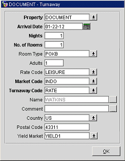 Depending on how you access this screen, information will be auto-populated as applicable. For example, if you provided a guest's name in the Name field in the Rate Query search criteria, the guest's name automatically appears in the Name field on the Turnaways screen. Or, if you search on a specific date by providing Start Date in the Detailed Availability screen search criteria, that date will appear in the Arrival Date field on the Turnaways screen when you select the Turnaways button.