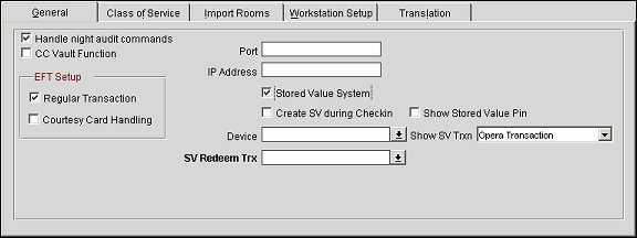 If configuring an interface other than an EFT, CCW, PBX, VID, SVS, MAK, TIK, MSC, MBS, or key card (DLS) interface, the General tab contains of the following options, depending on the interface you select in the Interface Status screen: