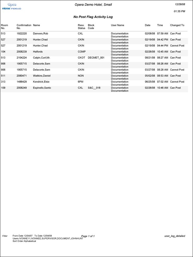 Reservations can be modified by any user who has permission, including changes to the "No Post" flag that determines whether the guest is allowed to charge to the room. The No Post Flag Activity Log report displays user log changes specific to the no-post flags on reservations.
