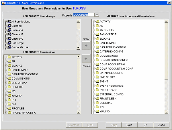 Grant. The Grant button moves user groups, permission groups or single permissions from the non-granted side of the screen (left) to the granted side (right). Available to the user when the application parameter General > Grant Individual Permissions is active for assigning permissions to Users and User Groups. When this application parameter is inactive, the user (hotel) can only grant permissions to User Groups.