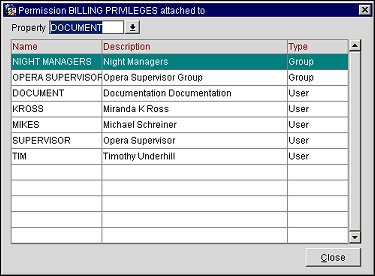 By selecting a user group or an individual permission and choosing the Grantees button, a screen displays which users belong to that group or have been granted that permission.