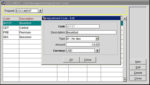Use the Yield Management Adjustment Codes screen to configure the yield adjustments that can be applied to a rate before it is compared to a hurdle rate when determining rate availability.